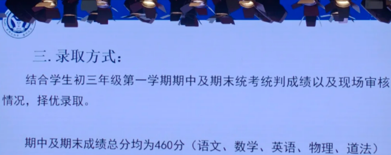 选拔依据:初三期中、期末成绩及现场审核情况,择优录取。