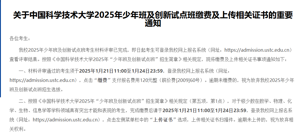 考生高考成绩只用于中科大少年班和少创班招生,不能填报其他高考志愿。
