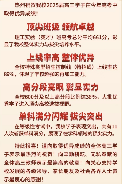 2025 年景山学校在高考战场上表现亮眼,北京市高考成绩前 100 名中,景山学校有 1 人(分数为 699 分),前 200 名中有 2 人,前 400 名里有 4 人,最终被清华、北大录取的人数达到了 6 人,双一流大学的录取率也超过了 60%,其攀峰班的平均分更是突破了 600 分。再看中考情况,2025 年景山学校的统招录取分数为 470 分,区排名为 1664,区排名占比是 24.46%,在东城区位居第六位。并且,今年共有 6 名接受清北人辅导的学生被景山学校录取,其中有 1 人进入了实验班。
