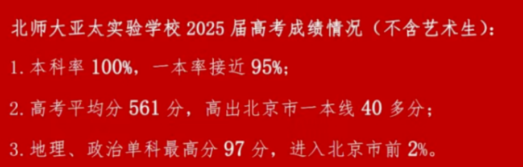 2025 年北师大亚太学校的高考成绩十分可观,本科率达到了 100%,一本率接近 95%,高考平均分数为 561 分,相较于北京市一本线高出了 40 多分。在中考统招录取方面,2025 年该校的录取分数为 467 分,区排名是 3646,区排名占比为 31.7%,在西城区的录取排名处于第十位。今年,有 3 名接受清北人辅导的学生被北师大亚太学校录取。