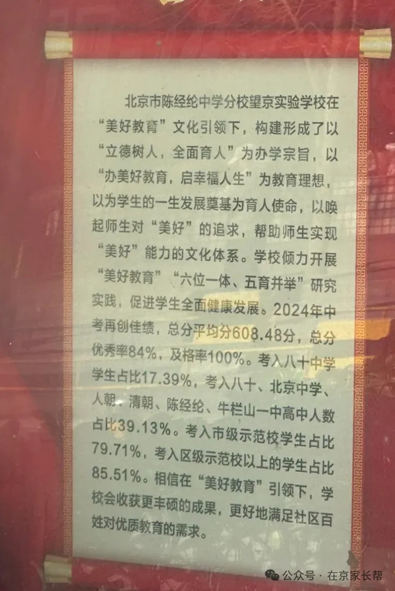 早在2024年陈分望京实验学校就已加入八十中集团。2024年平均分超区10.19分,17.39%学生考入八十中学,39.13%考入市级一批次。